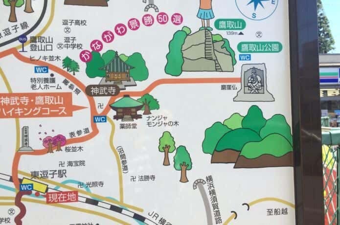 行きは神武寺駅をスタートして鷹取山公園に到着した後、帰りは東逗子駅へ向かう代表的なコースをご紹介します。まずは準備を整えて神武寺駅を出発。駅前にハイキングコース案内図があるので確認しておきましょう。