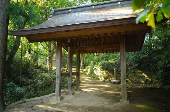 神武寺駅から西へ5分ほど進み、「神武寺・鷹取山ハイキングコース」の看板がある交差点を右折。逗子中学校を通り過ぎ、鷹取山登山口方面へ。さらに歩き、裏参道の並木をぬけて神武寺総門に到着。