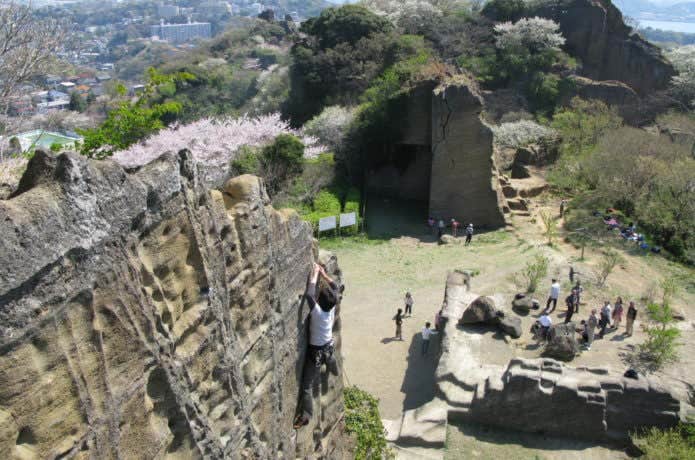 鷹取山の象徴的な岩壁は、クライミングスポットとしても長い歴史があり、週末には壁を必死に登るクライマーを見ることができます。