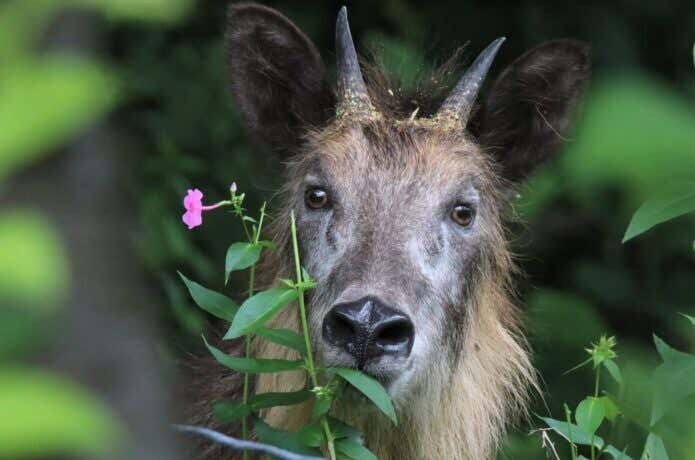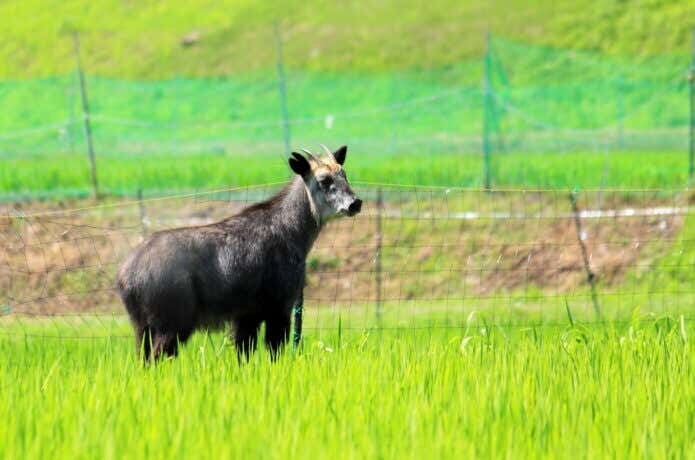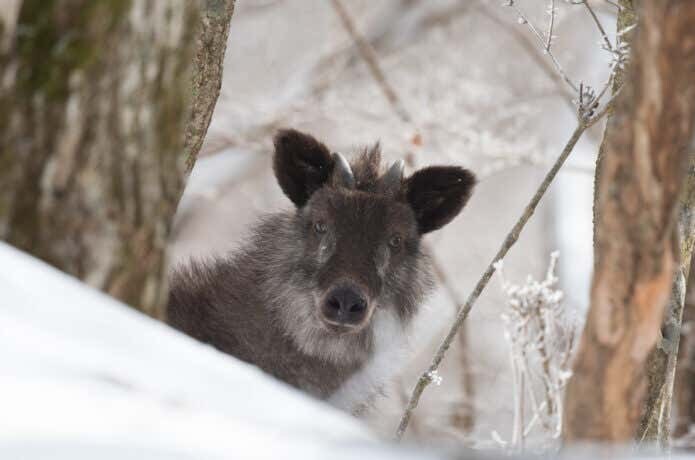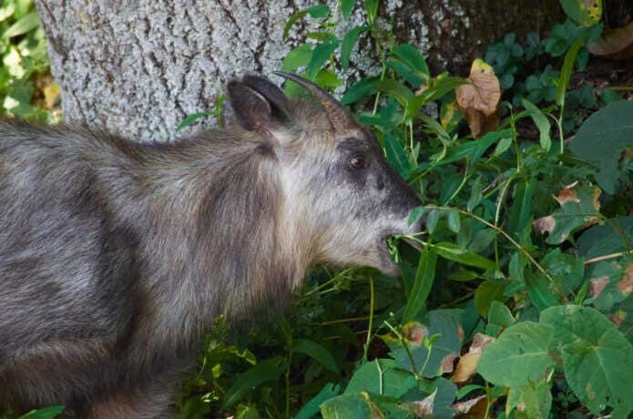 特別天然記念物のカモシカですが、現在は地域によって食害をもたらす害獣と化し、被害報告も増えています。植林地の幼木の枝先を食べたり、30種類近い野菜や果樹を食べ荒らす被害も。