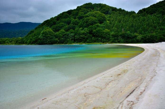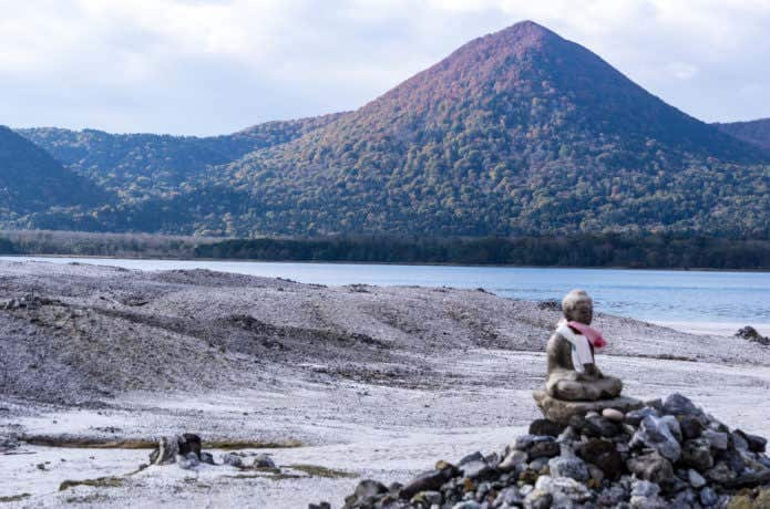 恐山のカルデラ湖、宇曽利山湖の湖畔は極楽浜と呼ばれています。宇曽利山湖は強酸性の湖で、動植物がほとんど存在しないため透明でより美しい湖となっています。極楽浜には、背面に大小さまざまな手形が彫られた地蔵菩薩像が建てられています。賽の河原で子どもが積み上げた供養塔を邪魔する鬼に救いの手を差し伸べるてくれるのが、この地蔵菩薩です。