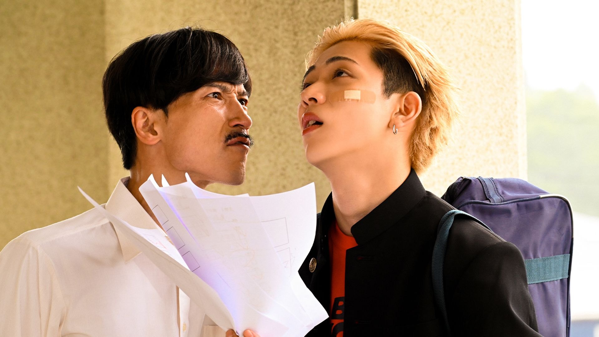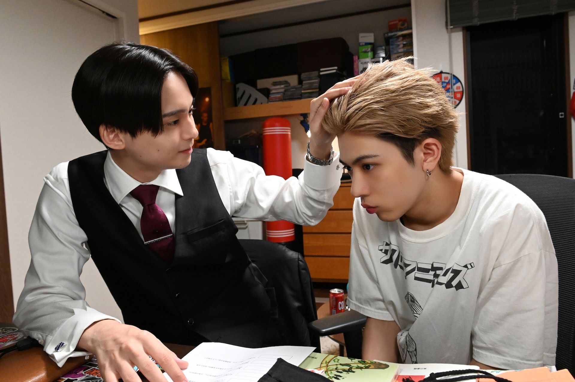 (C)奥嶋ひろまさ(秋田書店)/「家庭教師の岸騎士です。」製作委員会向かい合って見つめ合う沢村玲(ONE N' ONLY)と田中洸希(SUPER★DRAGON)