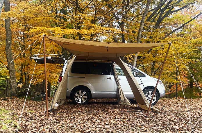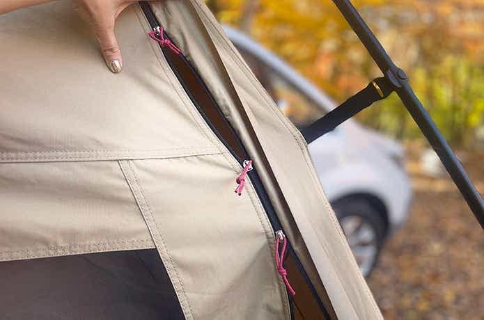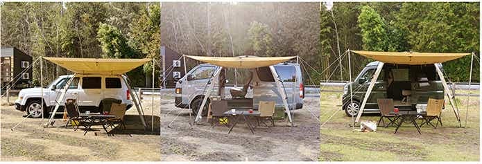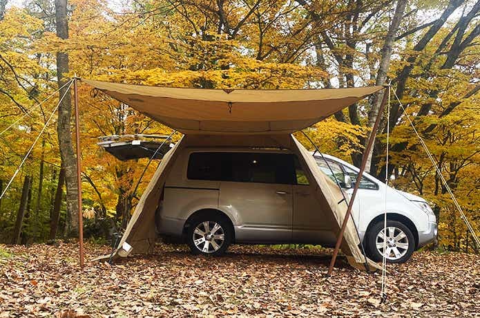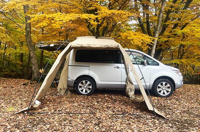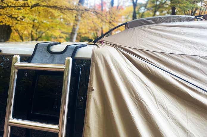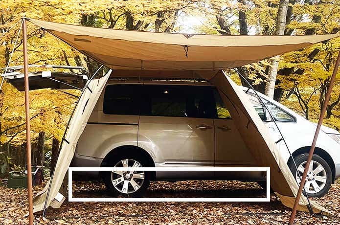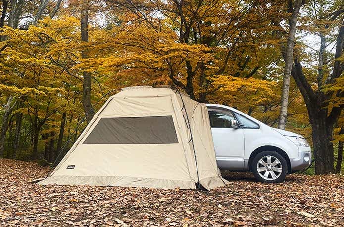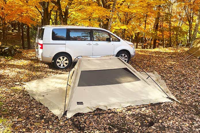 車側には壁がなく、カーサイドタープ同様、最短動線で車内と行き来できるのが魅力です。雨天時は濡れずに済むし、車内では窮屈な着替えなども立った状態でスムーズに行えます。