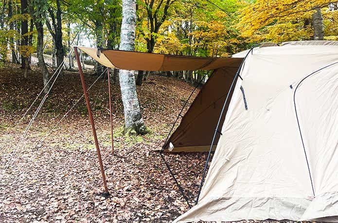 問題は、寒くなる秋冬シーズン。暖かく過ごすには、やっぱり壁のあるシェルターを設営することに。焚き火するなら、急な雨に備えて別途タープも必要です。
