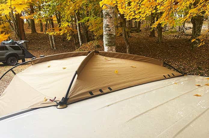 慣れたらここまで10分ほど。シェルターを起こしたら車に載せるように立てかけ、2カ所を車の天井部へ付属の吸盤で固定します。