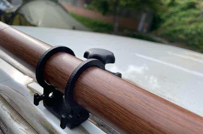最終的に、IGTテーブル用シンクが人気のブランド、37CAMPさんの「カーサイドタープ用ルーフベース(デリカD5専用)」を装着。ここへ手持ちポールを通してタープを装着していました。