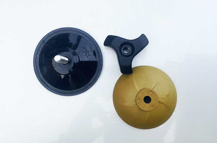 そして「からし色の半球=増圧板」は、実は固いプラスチック製。三角ネジで締めると吸盤へ圧力をかける役割を担いますが、あくまで補助的な印象です。