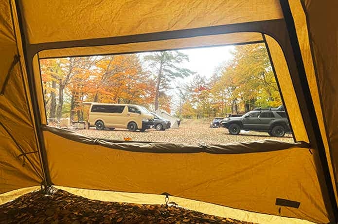 先日のキャンプも、窓枠効果で美しく切り取られたような紅葉の景色が最高でした。