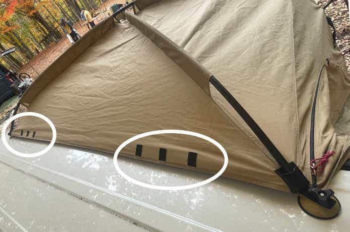天井部分車体側には、角の2カ所以外にも、左右に3カ所ずつ穴の空いたレザーパッチが装着されており、車種の幅やドアの位置などに合わせて取り付け位置を調整できる設計なんです。