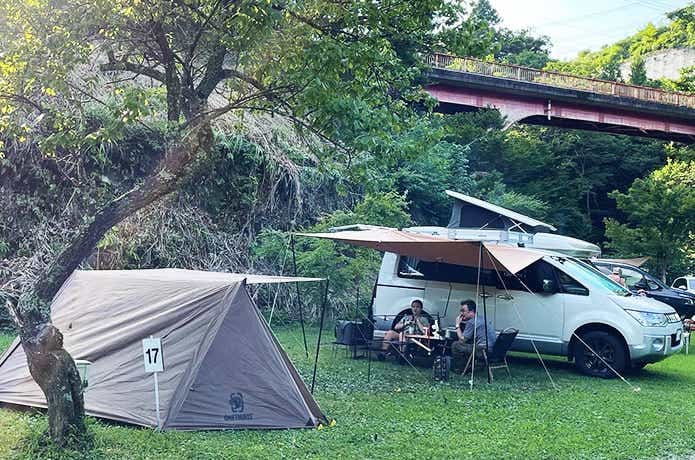 2人までは愛車のデリカD:5で寝られるので、カーサイドにタープを張った車中泊キャンプが断然手軽です。3人のときは、ソロテントを追加。