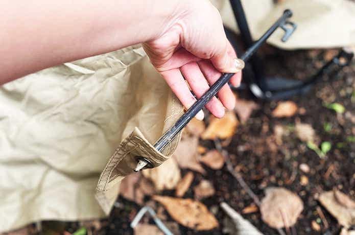 地面に置いた水平な状態でポールを曲げるのではなく、完成時のように少し起こしながら曲げていくと、スムーズに差し込めますよ。
