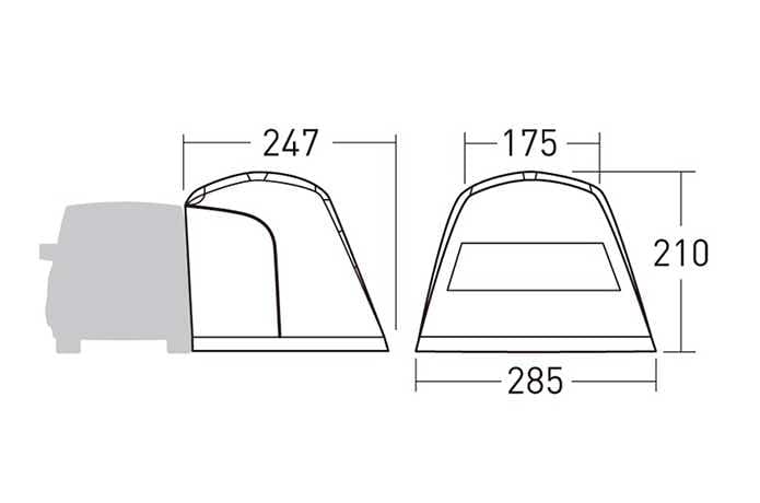 大きな窓側が正面となり、設営サイズは幅285×奥行き247×高さ210cm(全て最大値)。よくある4〜5人用ドームテントの2/3くらいの広さです。