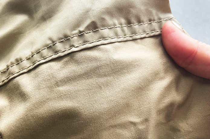 全体的に撥水加工、天井部分にはPUコーティングによる防水加工とシーム処理まで施されているので、多少の雨なら心配ナシです。