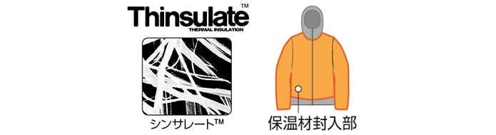 シンサレートは一般的なポリエステル綿と比べ、同じ厚さにおいて約2倍の保温力を実現した素材。繊維自体が保水しないため速乾性に優れ、中綿の片寄りがなく洗濯などのメンテナンスもしやすいのが特徴です。