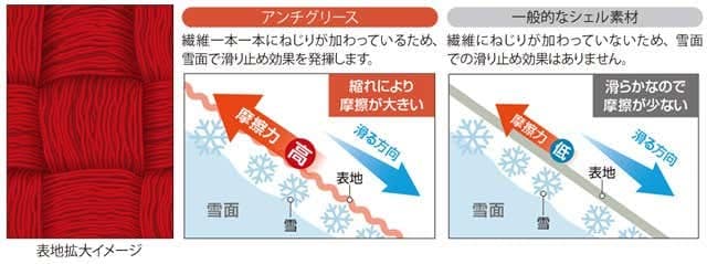 雪山では不意に転倒し、雪面を滑り落ちてしまう事故もあります。生地に雪面で滑りにくい加工をしたアンチグリース機能は、滑る危険性を軽減。雪が付きにくいというメリットもあります。