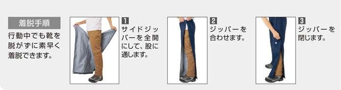 ジッパーでサイドを全開にできるので、登山靴やアイゼンを履いたまま脱着できるのが特長です。