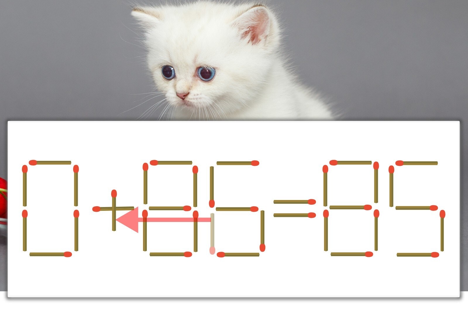 「6」を別の数字に変化させると答えが導き出せます。「6」のマッチ棒を1本移動して、「-」を「+」にしてみましょう。すると、「0+85=85」が成立します。