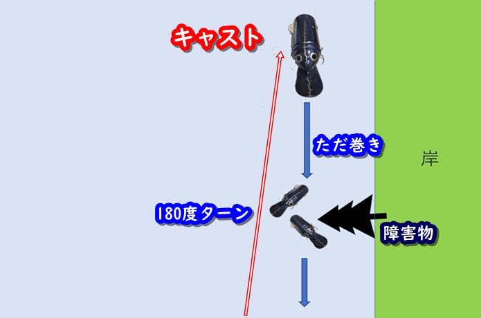 岸際やブレイクラインを意識し、音を立てながら一定のリズムをキープしながら巻くだけでビッグバスが飛び出してきます。障害物際に差し掛かった時には、180度ターンで攻めてみてもよいかもしれません。