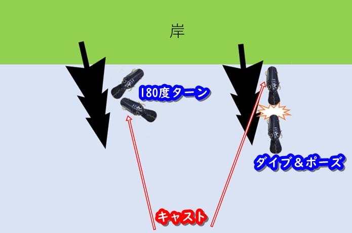 水深が浅ければ、スローなテンポでの180度ターンがおすすめ。ワームやラバージグの釣りのイメージしながら丁寧に誘うことが重要です。