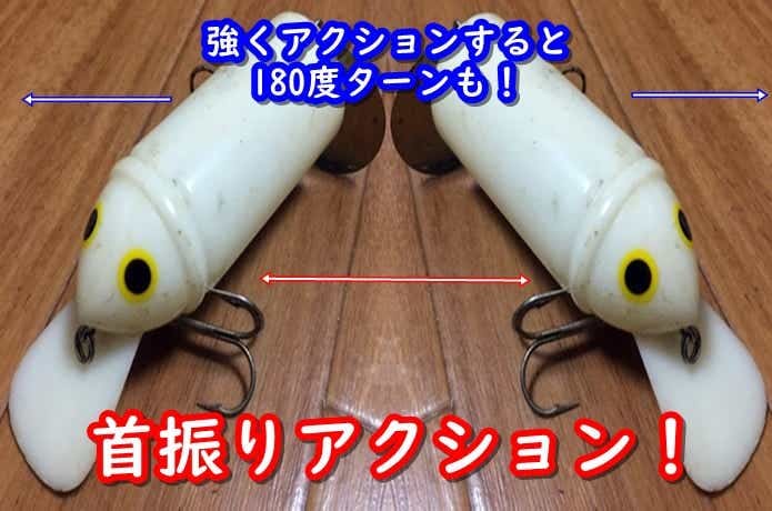 また、ペンシルベイトをドッグウォークアクションさせるように竿先をチョコン、チョコンと煽ってやると首振りアクションを演出。さらに強く煽れば、その場で180度ターンもキメられます。