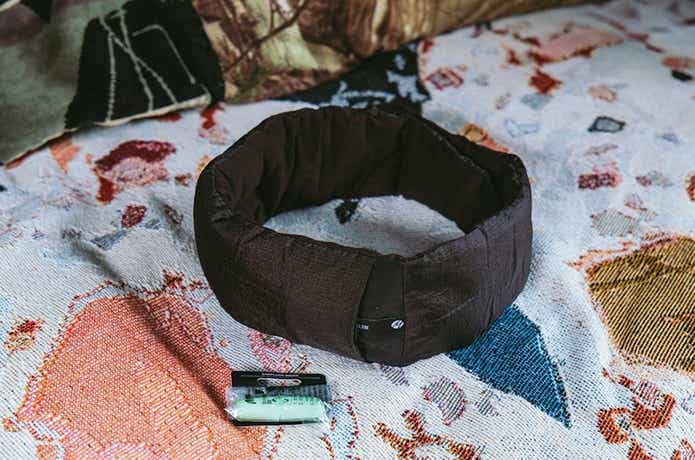 アイマスクは、ベルクロ装着式で頭に巻き付けるタイプ。かんたんに締め具合を調整できるから、隙間ができにくくしっかり遮光してくれます。