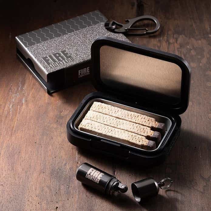 「防水ケース」で水に濡らさずコンパクトに携行できるだけでなく、「スリーブケース」で1本ずつ切り離すのもスムーズ。「防水オイルライター」があれば万一の備えもバッチリです。