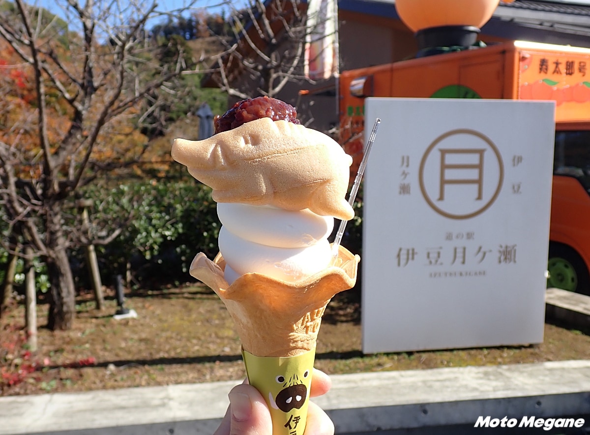 伊豆半島を縦断する国道414号沿いにある「道の駅 伊豆月ヶ瀬」は、ツーリング途中の立ち寄りスポットとして人気の道の駅だ。清流・狩野川を望む開放的なロケーションに加え、ここでしか味わえないご当地グルメが揃っている。なかでも注目したいのが、地元銘菓とミルクソフトを組み合わせた必食スイーツ「猪最中ソフト」。伊豆らしさが詰まった一品を求めて、多くのライダーや観光客が訪れている。