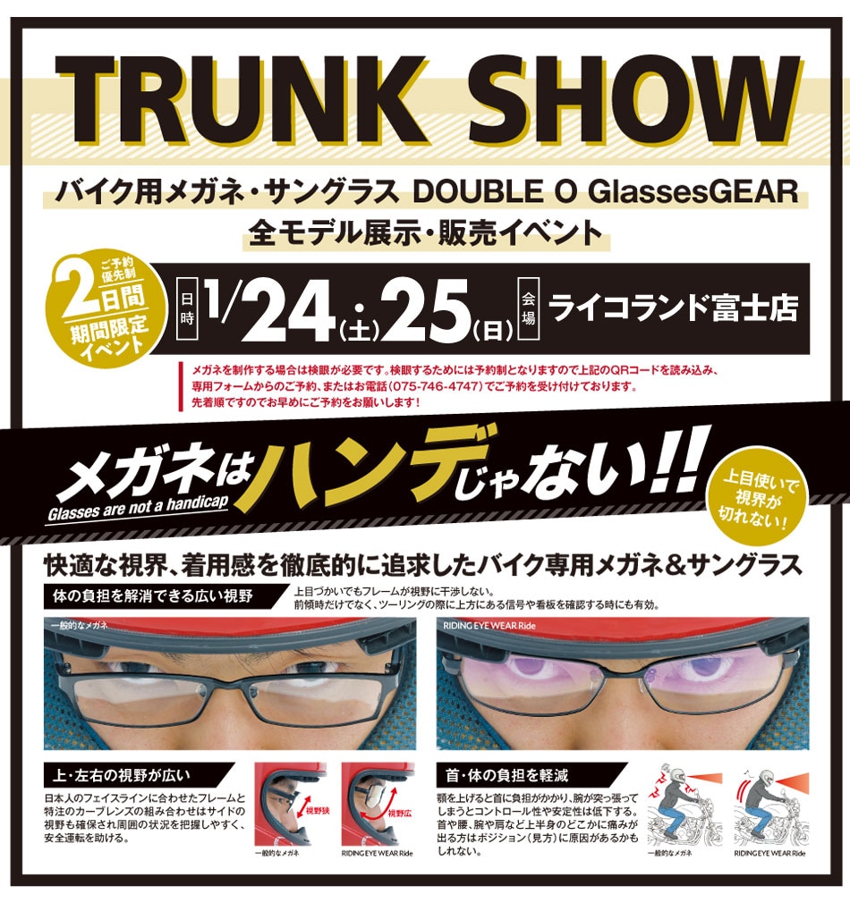 ダブルオーグラスギアは、バイク用メガネが体感できるイベント「TRUNK SHOW」を2026年1月24日(土)~25日(日)に、ライコランド冨士店で開催すると発表した。