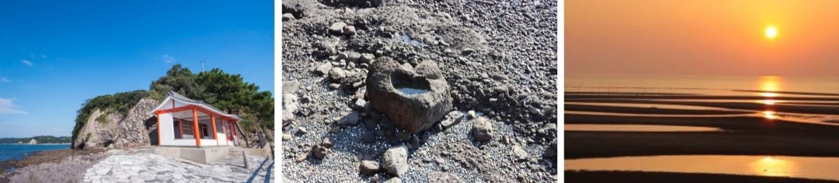 ここでの運試しは、干潮時にだけ姿を現すハート形の「叶え岩」。岩のくぼみをめがけて「願い石」を投げ、見事に入ると願い事が叶うといわれています。