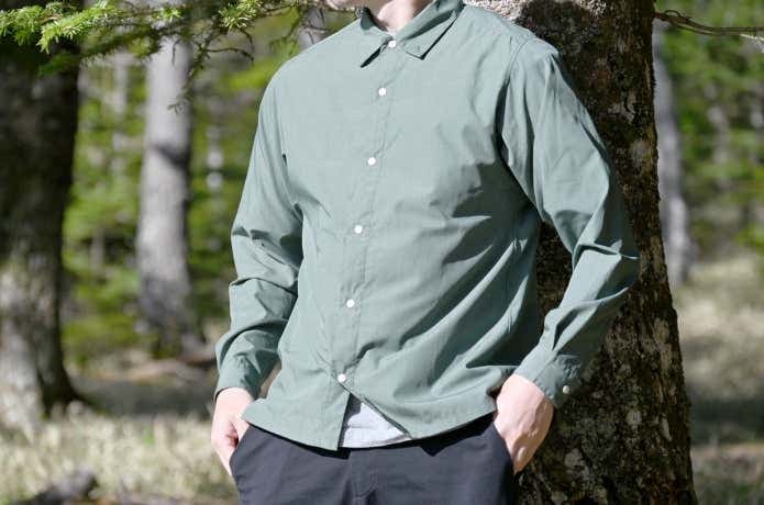 吸湿速乾性に優れたポリエステル100%素材で、さらりとした着心地と薄手の生地ならではの通気性が魅力。発汗量の多い夏にもおすすめの山シャツです。