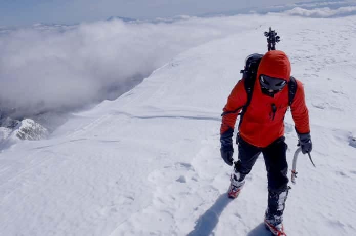 雪山では、生地が厚く耐久性や防風性の高いハードシェルが一般的。厳冬期の稜線上では必須となるアイテムです。