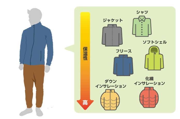 保温性と汗処理機能のバランスが良い、ジャケットやフリース、ソフトシェルがおすすめ。休憩時などのじっとしている時用にダウンなどの保温着も持っておきましょう。 -