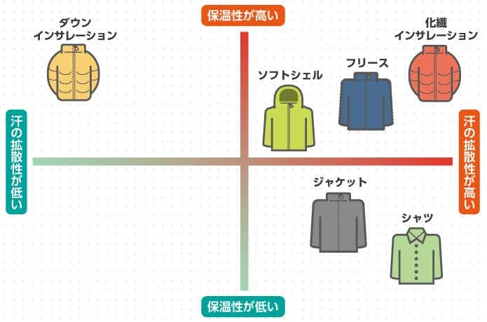 例えばフリースでも、薄手のものはオールシーズン使えますが、厚手のものは冬に特化していたり行動着には向いていなかったりします。そのため上図の関係性はあくまでも大まかな概念として捉えてもらえればと思います。