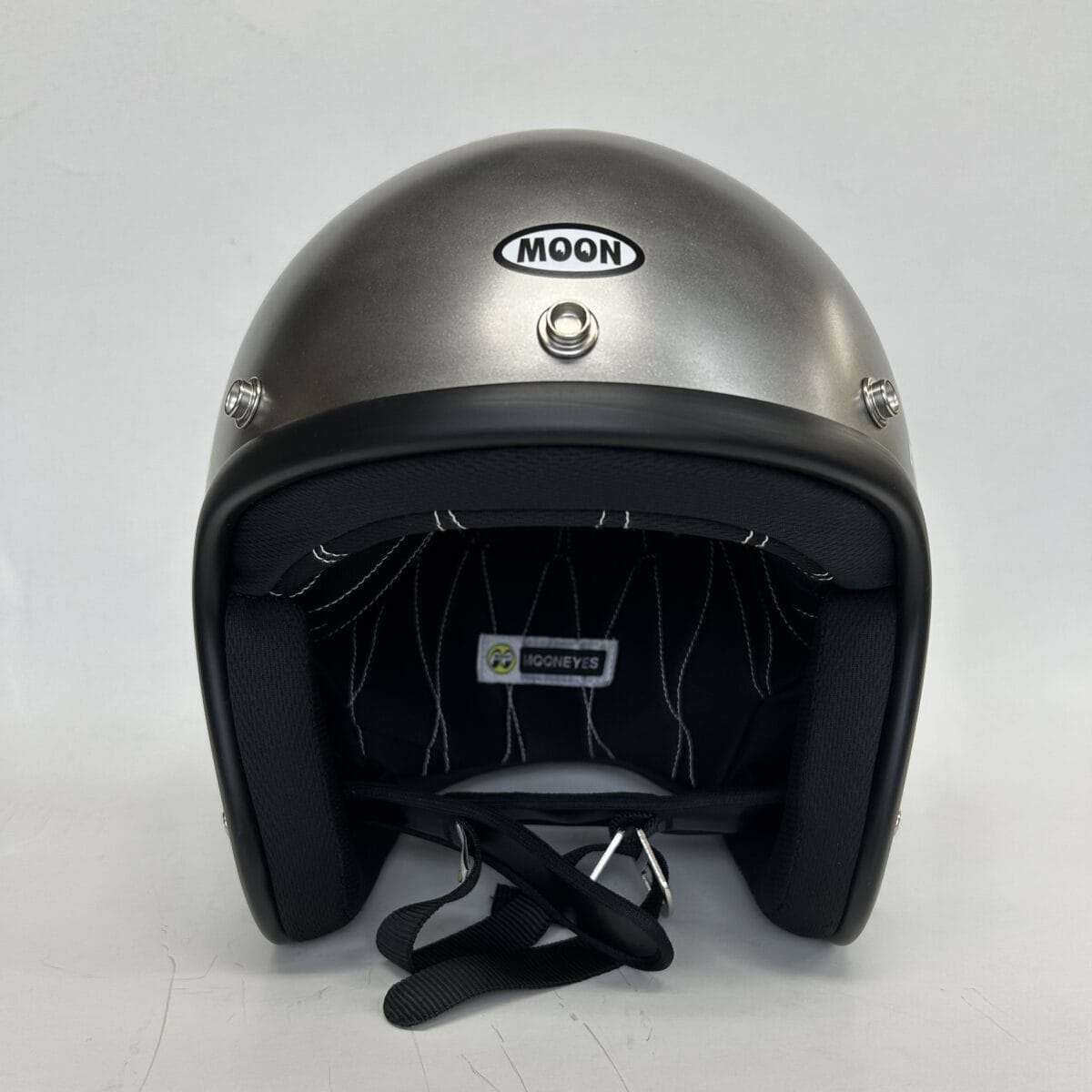 MOONEYESヘルメット029の昨春限定色でリリースしたベアメタルモデル。即完売したあともリクエスト頂き、その声に応えて再販されるベアメタルカラーとはジェット機のボディーを塗装する前の無垢な金属の色。これを再現した渋銀色だ。