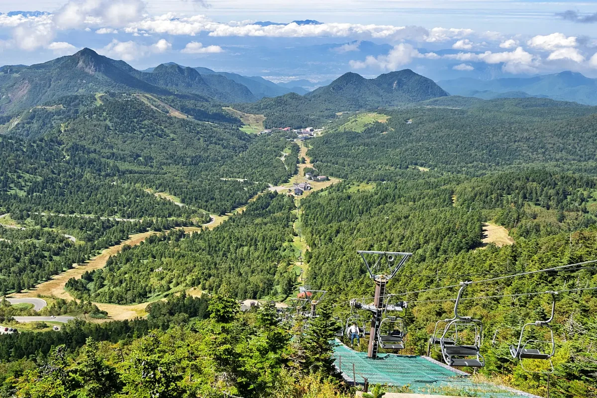 横手山(標高2307m)は、志賀高原最高峰。国道292号の「のぞき駐車場」からスカイレーターとスカイリフトで山頂へ登れます。満天ビューテラスからの、笠ヶ岳や志賀高原、北アルプスの眺望は絶景のひと言。天下を取った気分になれます。