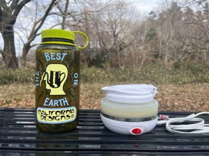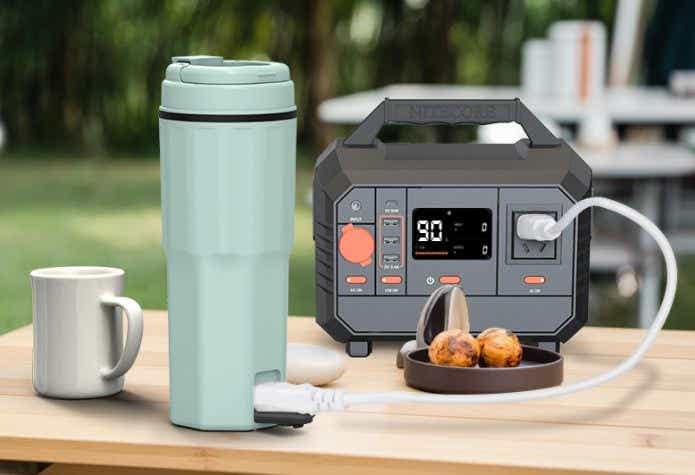 そこで便利なのが、コンパクトな電気ケトル! 今や持っている人も多いポータブル電源で給電して、必要な分だけのお湯をサッと沸かせて超便利。