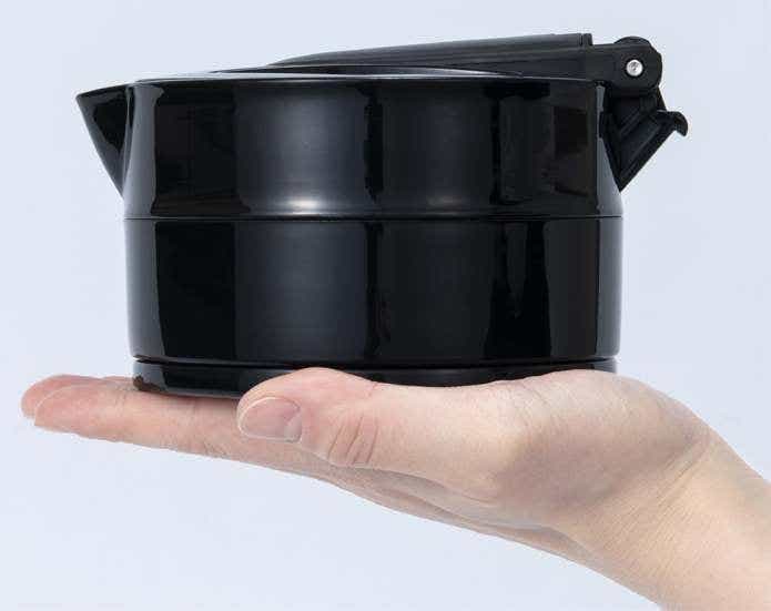 こちらの電気ケトルは、くしゅっと潰して3分の2程度の厚さに収納できるスグレモノ! シリコン製の本体はじゃばら状にたためて、取っ手は蓋に収納できます。