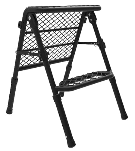 耐荷重は、タイヤラダーの状態で約100kg、開脚時は150kg。重いクーラーボックスやポータブル電源など、大抵のものは置ける頼もしさです。 脚は根元のボタン1つで簡単に、4段階の高さに調整可能。地面から足場までの高さを60・65・70・75cmに変えられるので、自宅などでも便利なんです。