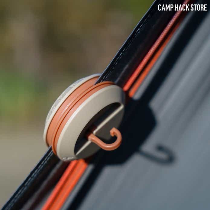 磁石でくっついている2つをパカっと外し、フックがある方とない方に分け、テントやタープ等に挟みます。あとは片側の本体を持って、好きな位置までスライドすればOK! 内部には超強力なネオジム磁石が2つずつ搭載されていて、ガッチリ固定してくれます。