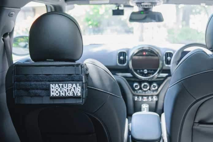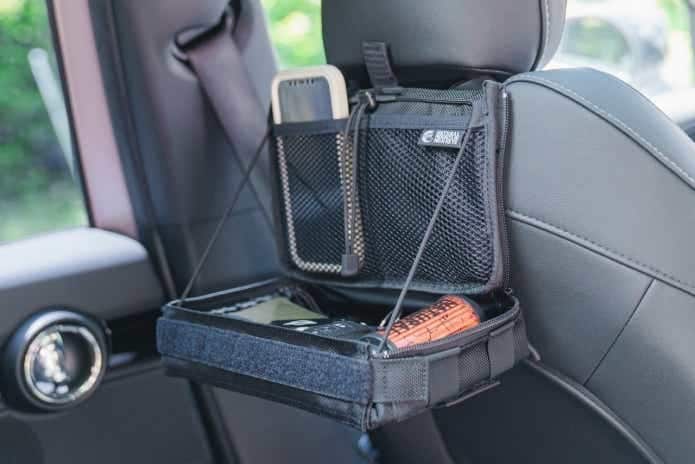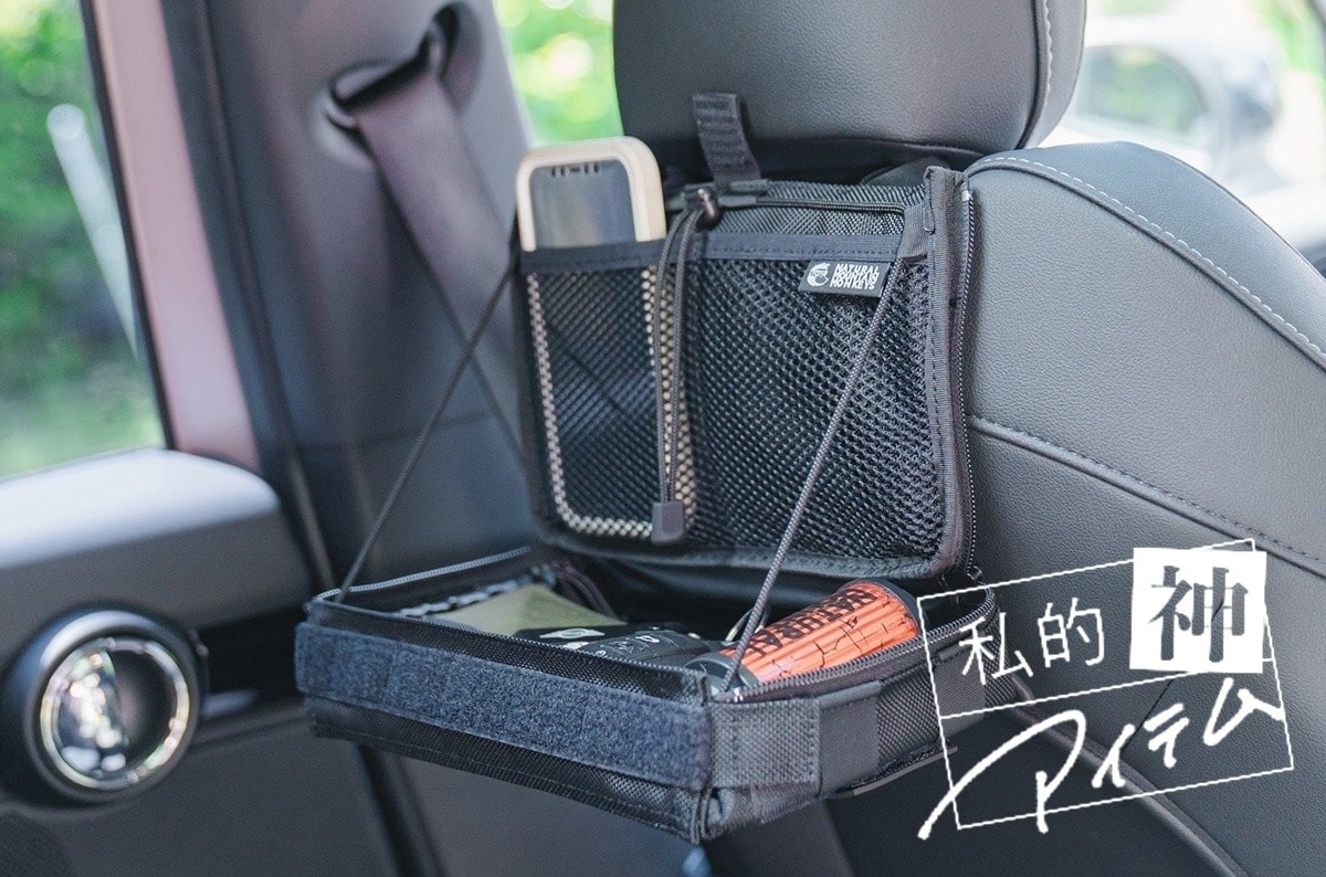 チェアのサイドポケットとして装着できるようベルトで取り付けるというこの構造を、まさかのカー用品にアレンジするというセンス光るアイディア。