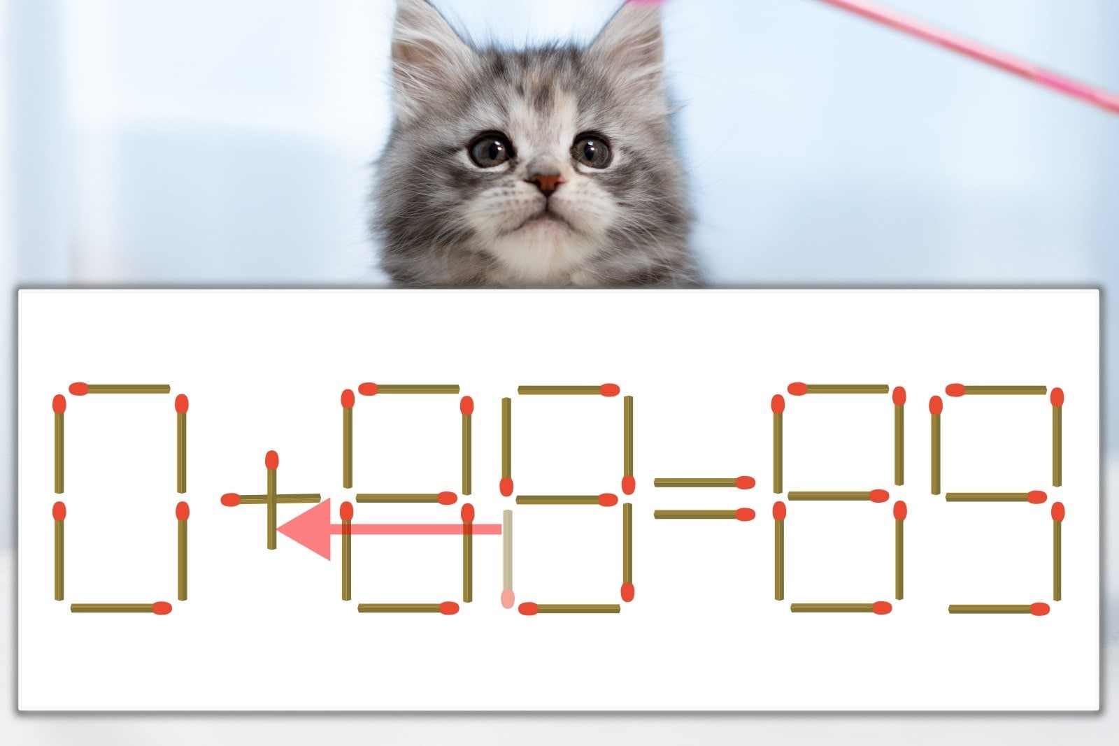 「8」を別の数字に変化させると答えが導き出せます。一の位の「8」のマッチ棒を1本移動して、「-」を「+」にしてみましょう。すると、「0+89=89」が成立します。