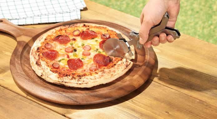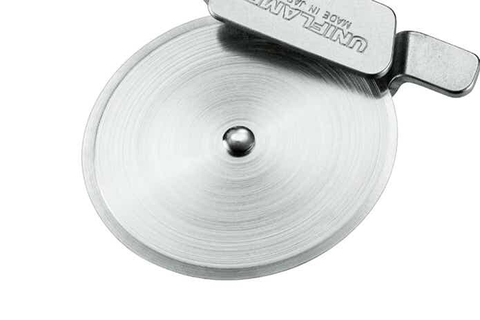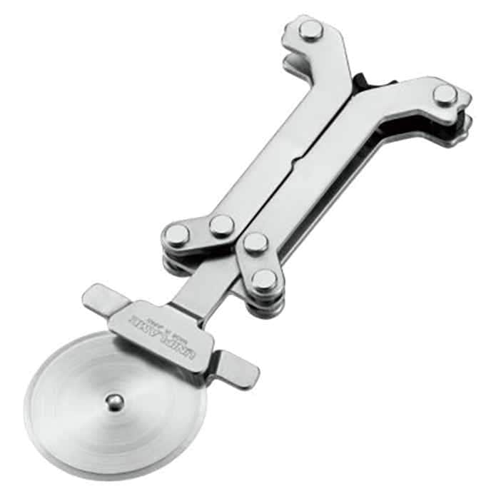 一見するとシンプルな金属プレートのような、このアイテム。実は広げるとピザカッターに変身! 「UFピザカッター」は、名前のとおりピザ用のカッティングツール。厚さ3.0mmの極厚ステンレス鋼を採用した刃は、耐久性が高くキャンプでもガシガシ使える頼もしさです。