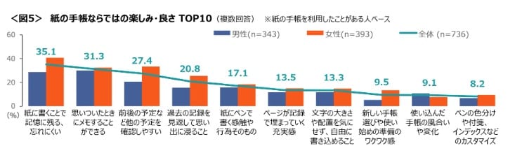 紙の手帳ならではの楽しみ・良さとして上位に挙がったのは、「紙に書くことで記憶に残る・忘れにくい」(35.1%)、「思いついたときにメモすることができる」(31.3%)といった“書く行為”にまつわるポイント。さらに女性では、「前後の予定などを確認しやすい」「過去の記録を見返して思い出に浸れる」「紙にペンで書く感触や行為そのもの」など、紙ならではの情緒的な魅力を感じる人が多い傾向が見られた。