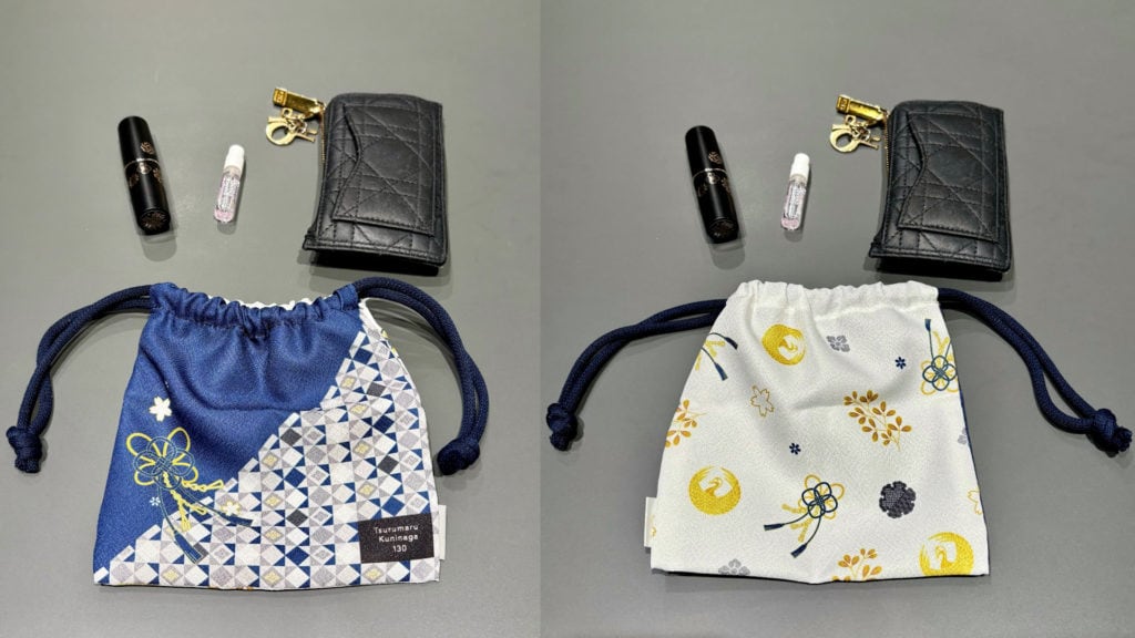 巾着袋は約高さ17cm×幅16.5cmと、小物をまとめるのにちょうど良いサイズで、表裏で異なるデザインを楽しめます。