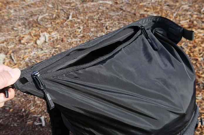 ロールトップ式の開口部は、なんとジッパー付きです。背負い心地のバランスは崩れるかもしれませんが、お土産等で荷物が増えてしまった場合は、ロールをせずに、吹き流しめいっぱいまで、荷物を入れることができます。
