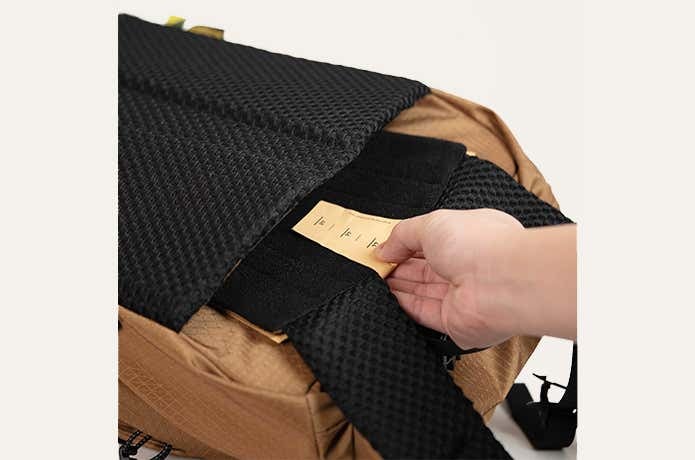 というのも、モマドを空荷で上部から押すと柔らかいのですが、荷物を入れて押すとバネのような弾力が出てきます。背面パネルフレームが、パックと背中にチュラルな一体感を生んでくれるんです。