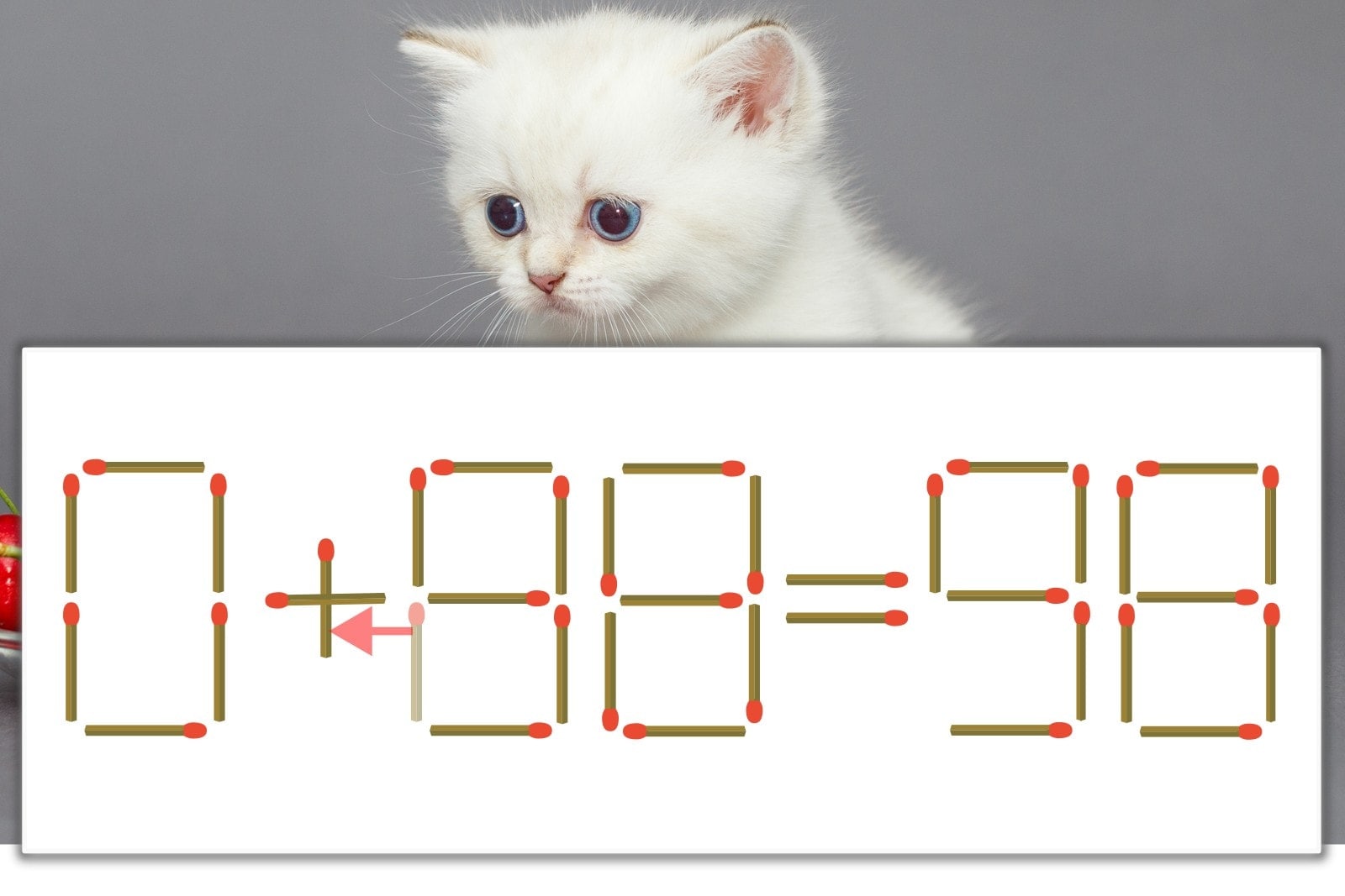 「8」を別の数字に変化させると答えが導き出せます。十の位の「8」のマッチ棒を1本移動して、「-」を「+」にしてみましょう。すると、「0+98=98」が成立します。