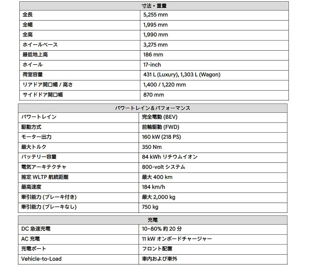 パワートレインは、前輪に160kW(218ps)のモーターを搭載。バッテリー容量は84KWhで、電気システムは最新の800Vの高電圧方式としている。航続距離はWLTPモードで約400kmとなっている。