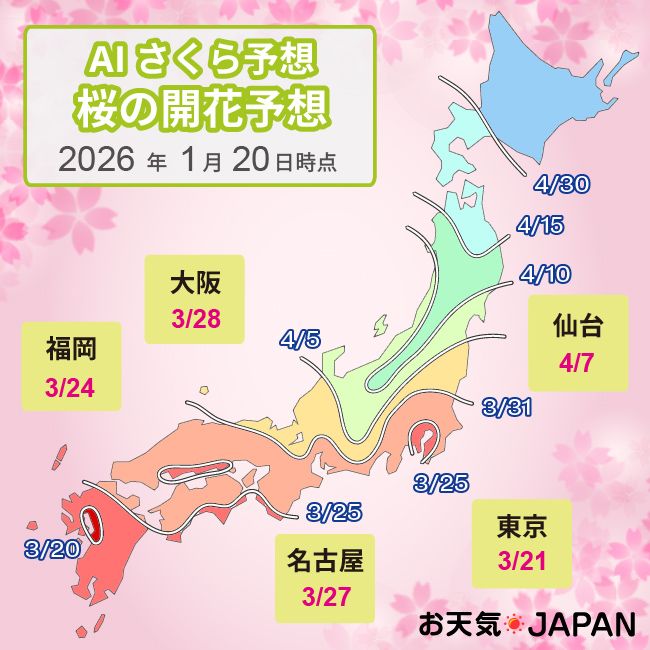2026年「AIさくら予想」発表! 一番乗りは熊本・佐賀で3/20、東京は3/21に開花見込み