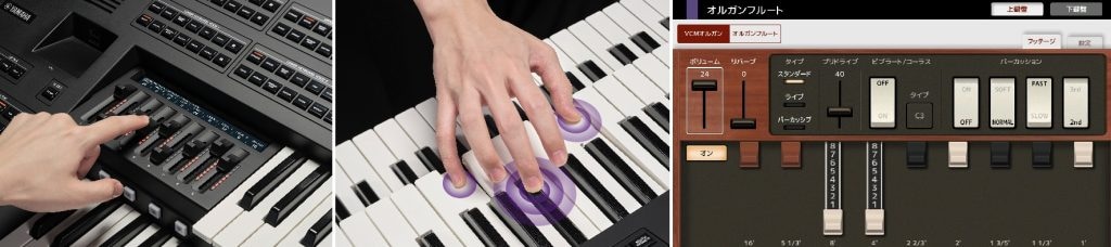 サウンド面では、ビンテージ機材の回路を部品レベルで再現するヤマハ独自の「VCMテクノロジー」を用いたVCMオルガン音源を搭載した。これにより、トーンホイール方式のビンテージオルガンが持つ特有の深みやロータリースピーカーの効果を忠実に再現しており、パネル上のスライダーをドローバーとして操作することで、伝統的なオルガン演奏の醍醐味を存分に味わうことができる。